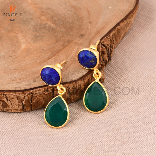 18K Gold 925 Silver Lapis & Green Onyx Dangle Earrings
