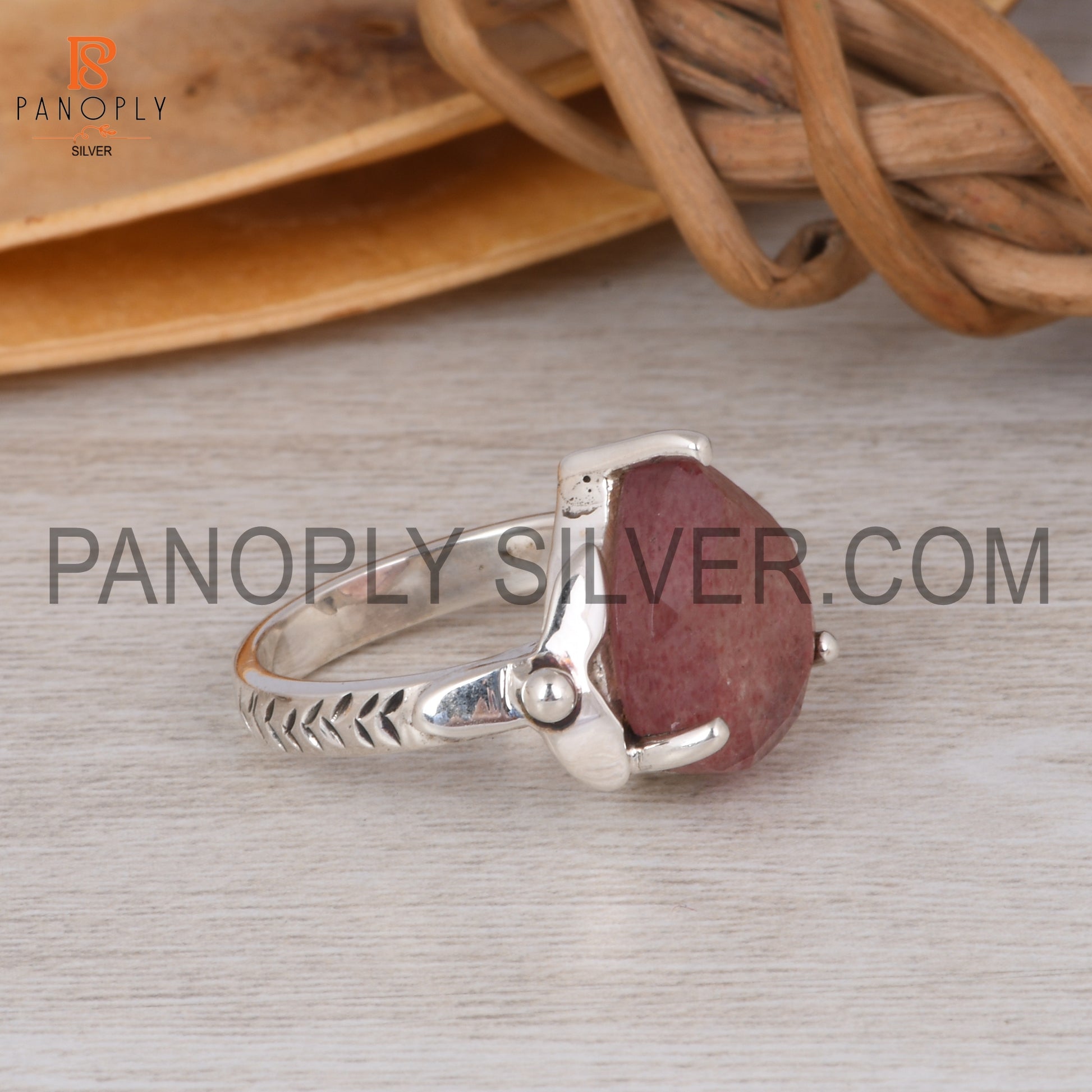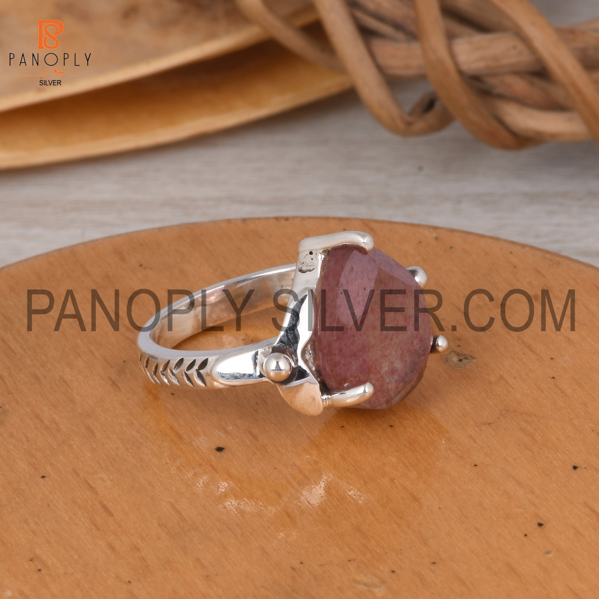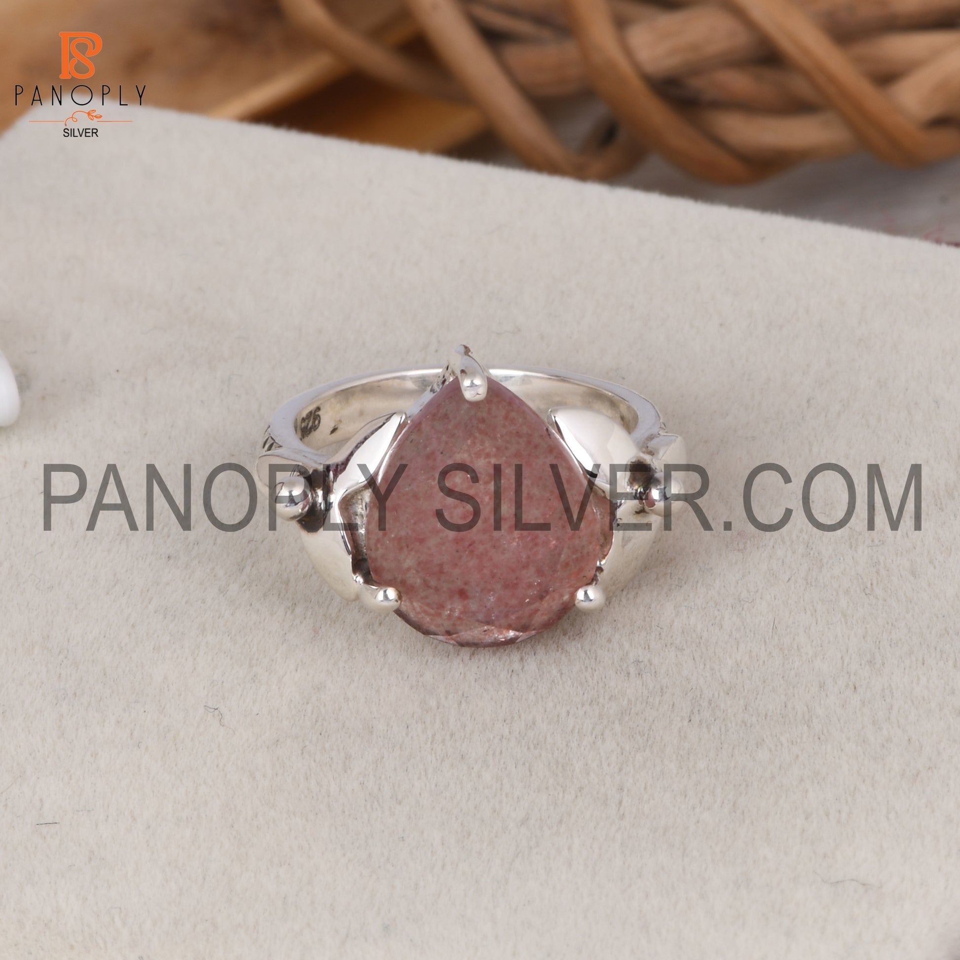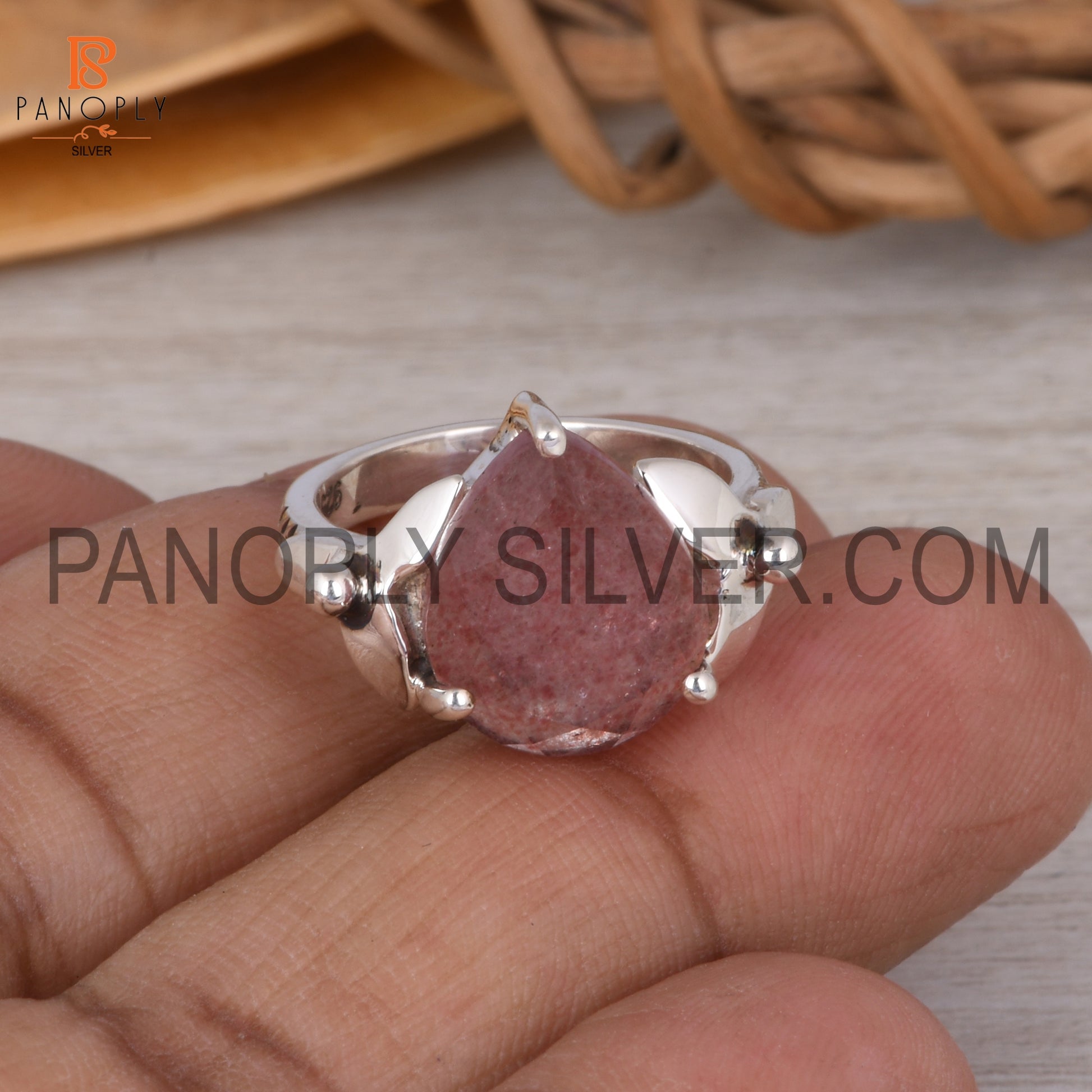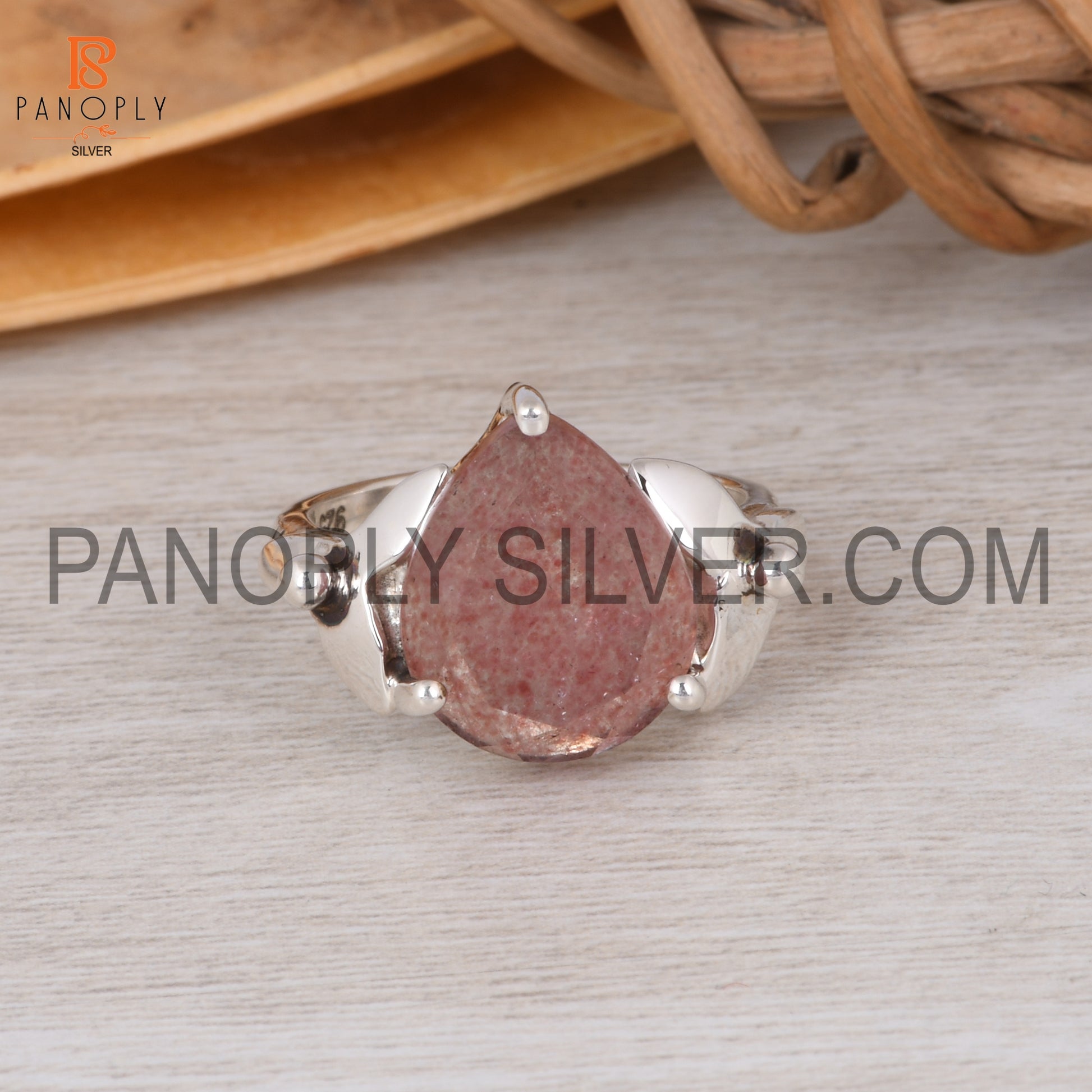 Strawberry Quartz Leaf Band Pear Shape Engagement Ring