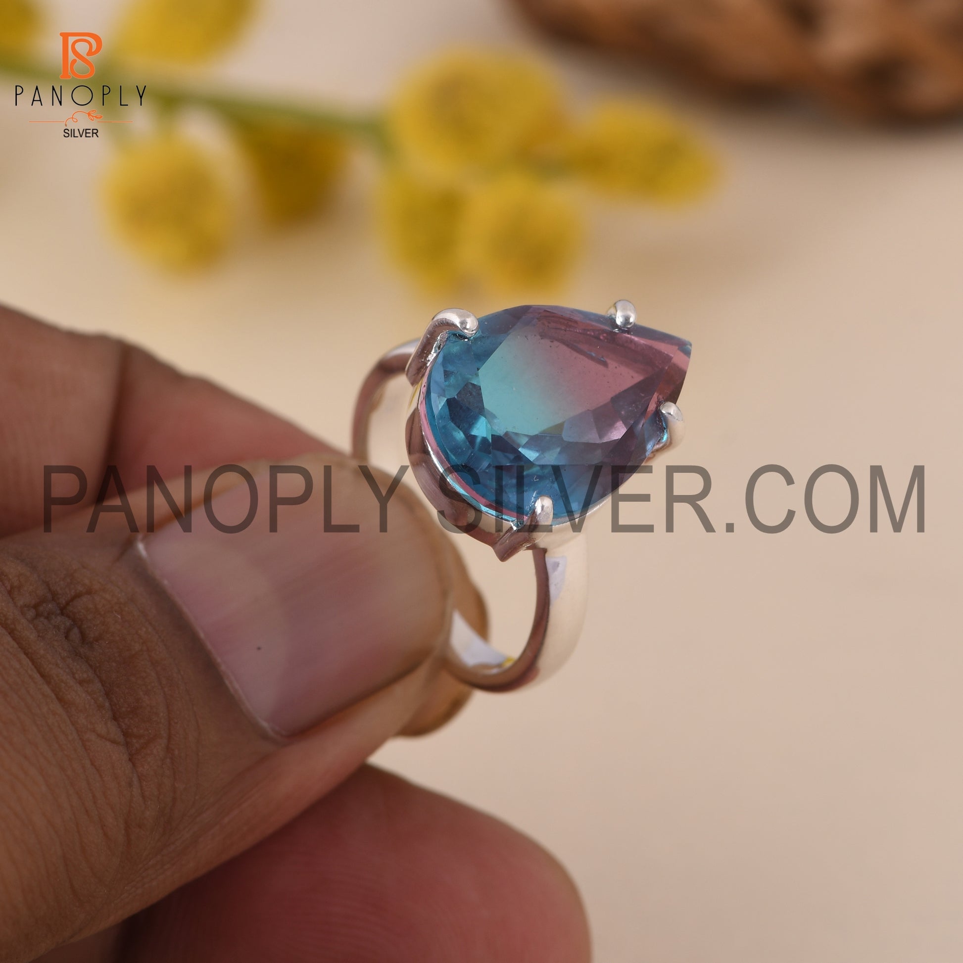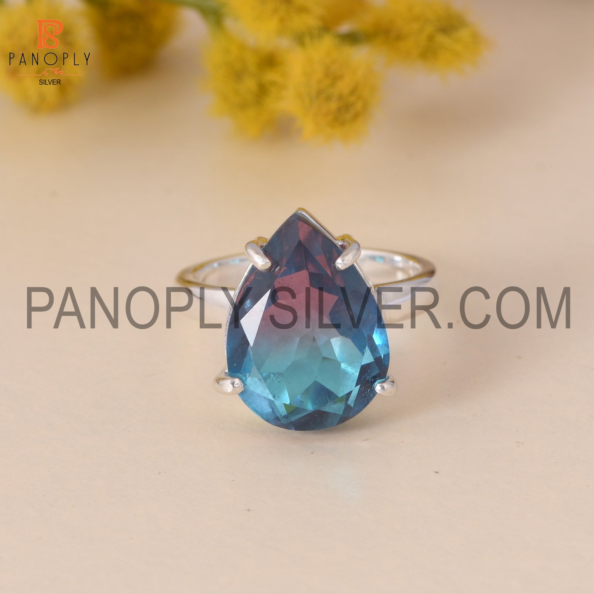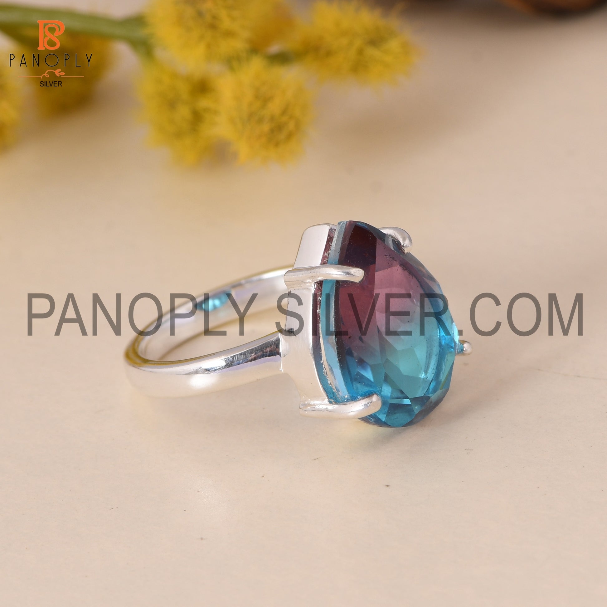 Fine 925 Silver Pear Cut Bio Alexandrite Doublet Quartz Set Ring