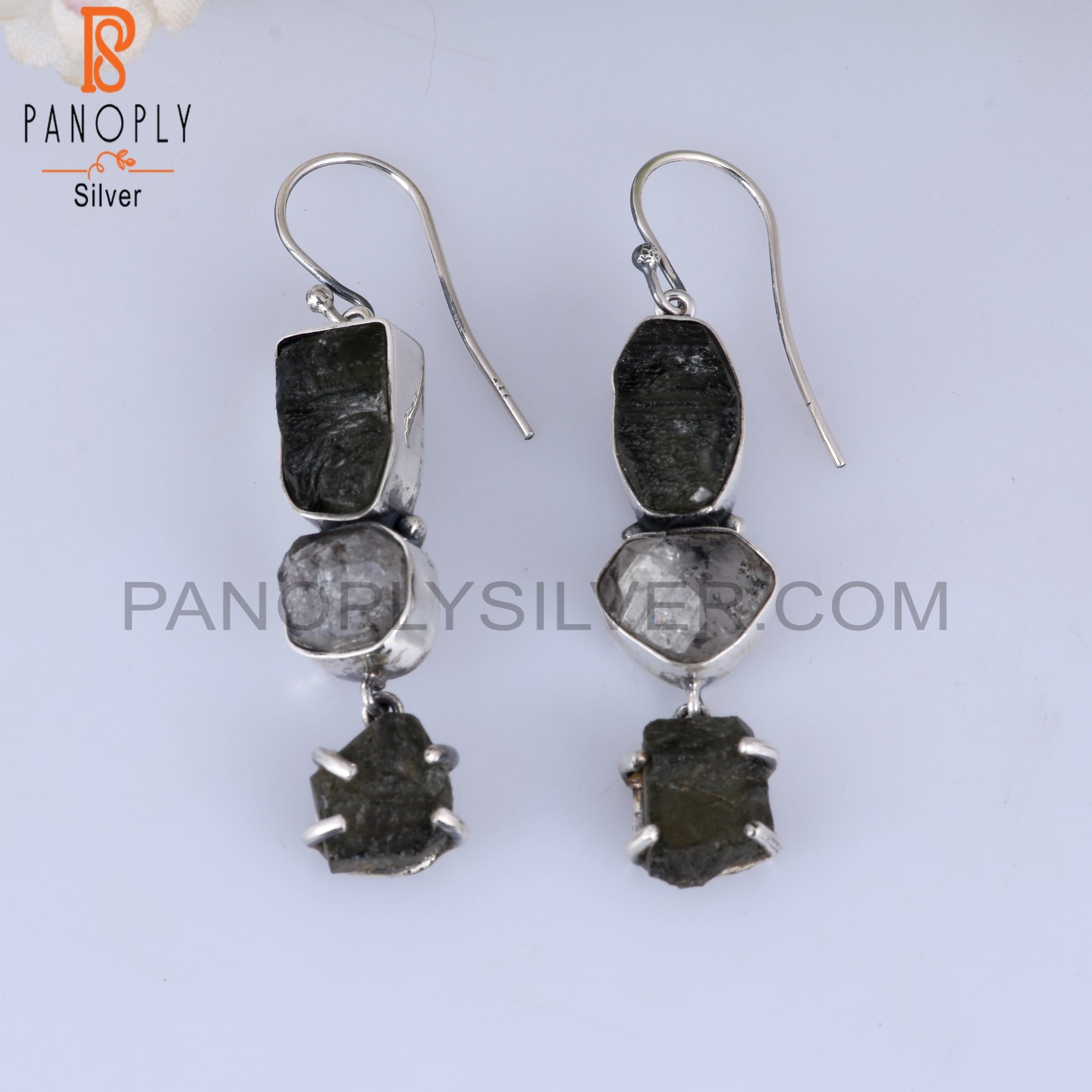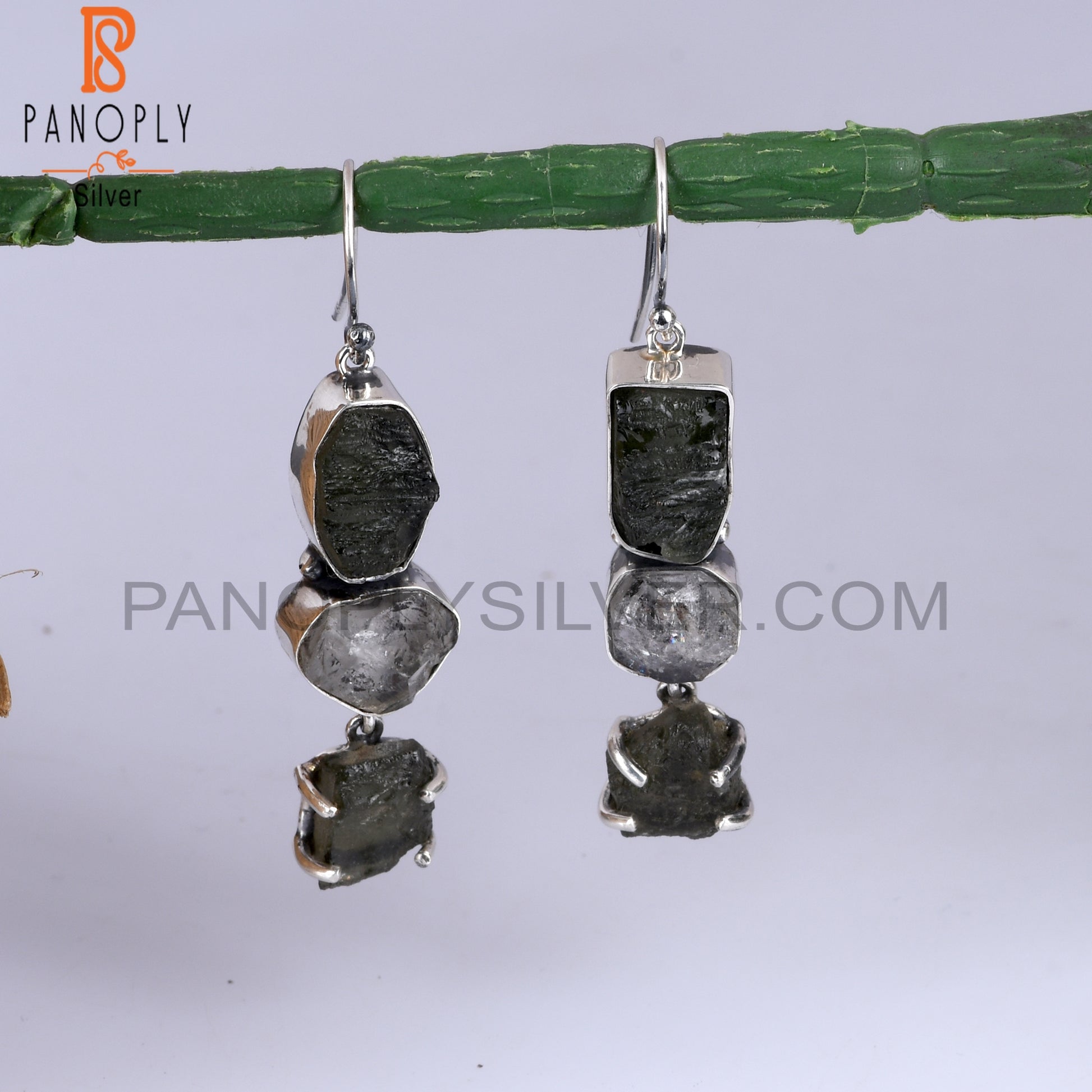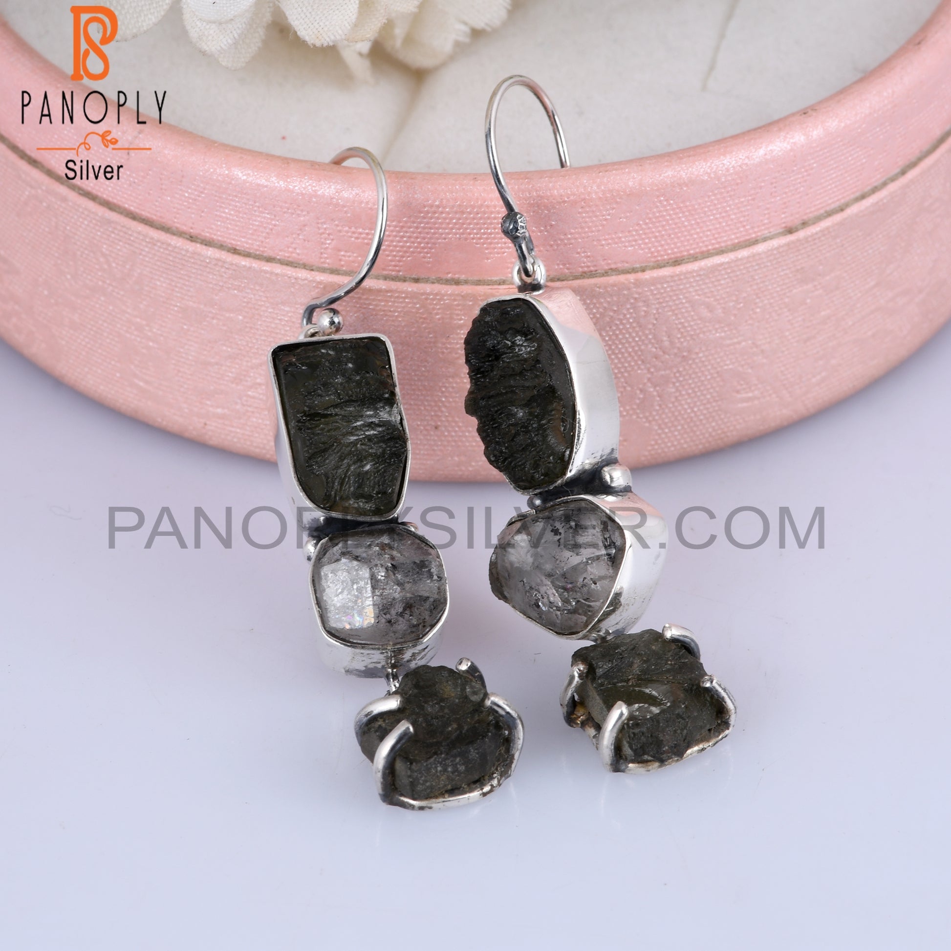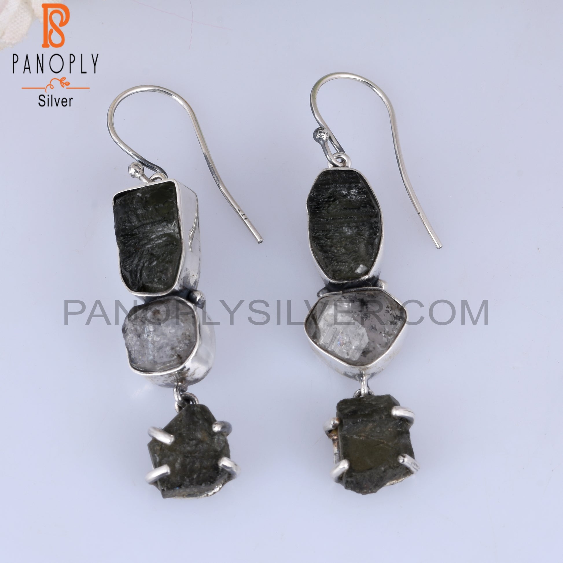Simple Herkimer Diamond & Moldavite 925 Silver Earrings