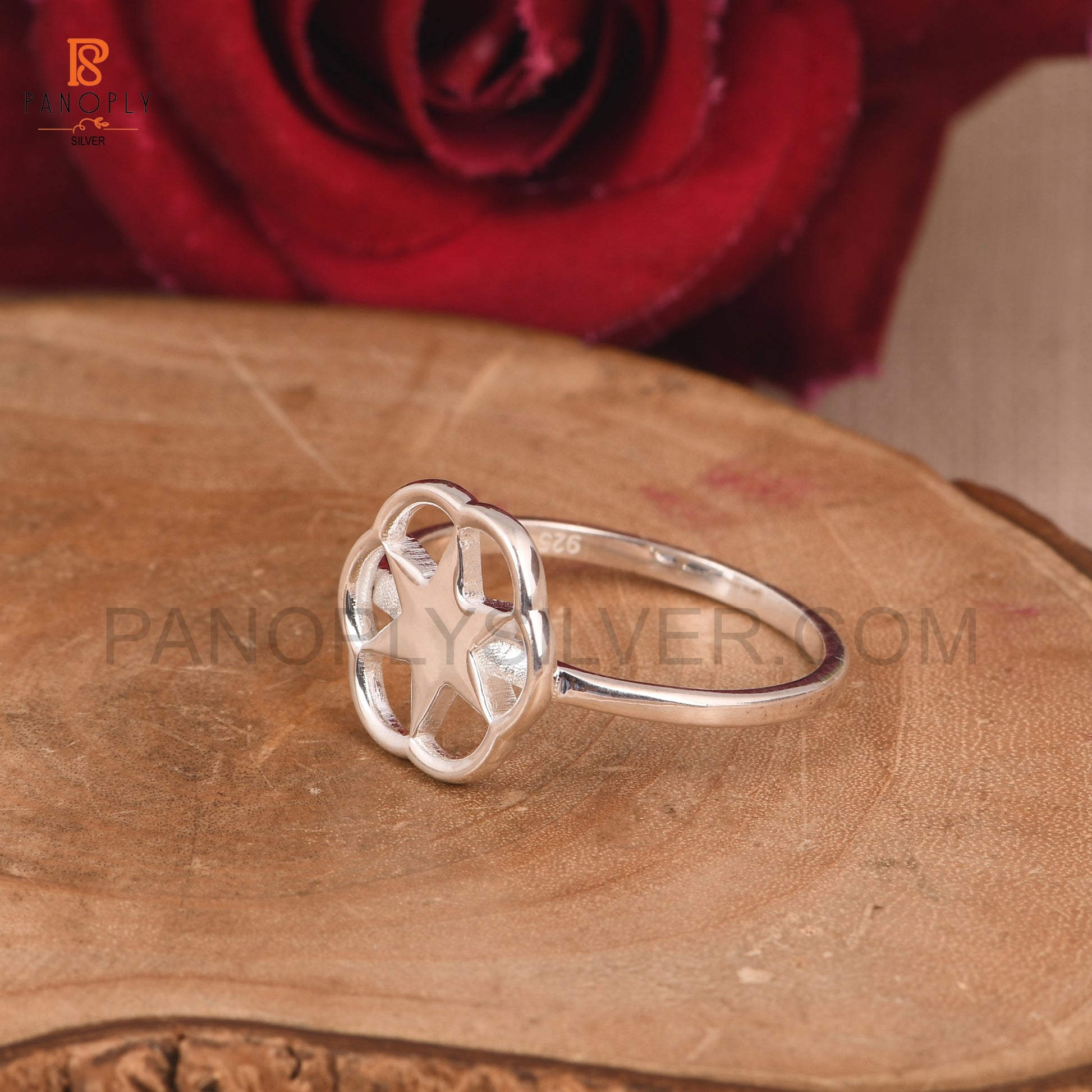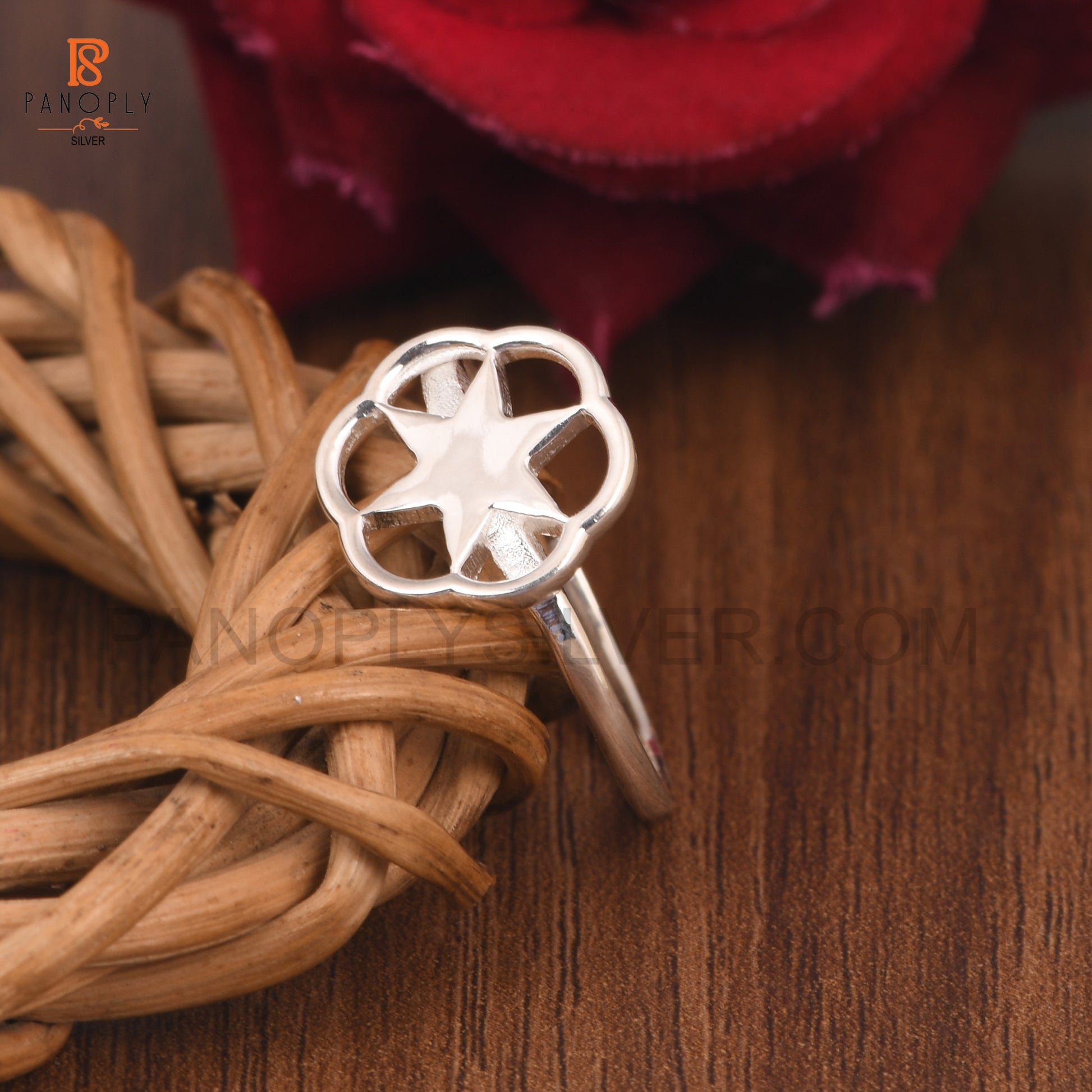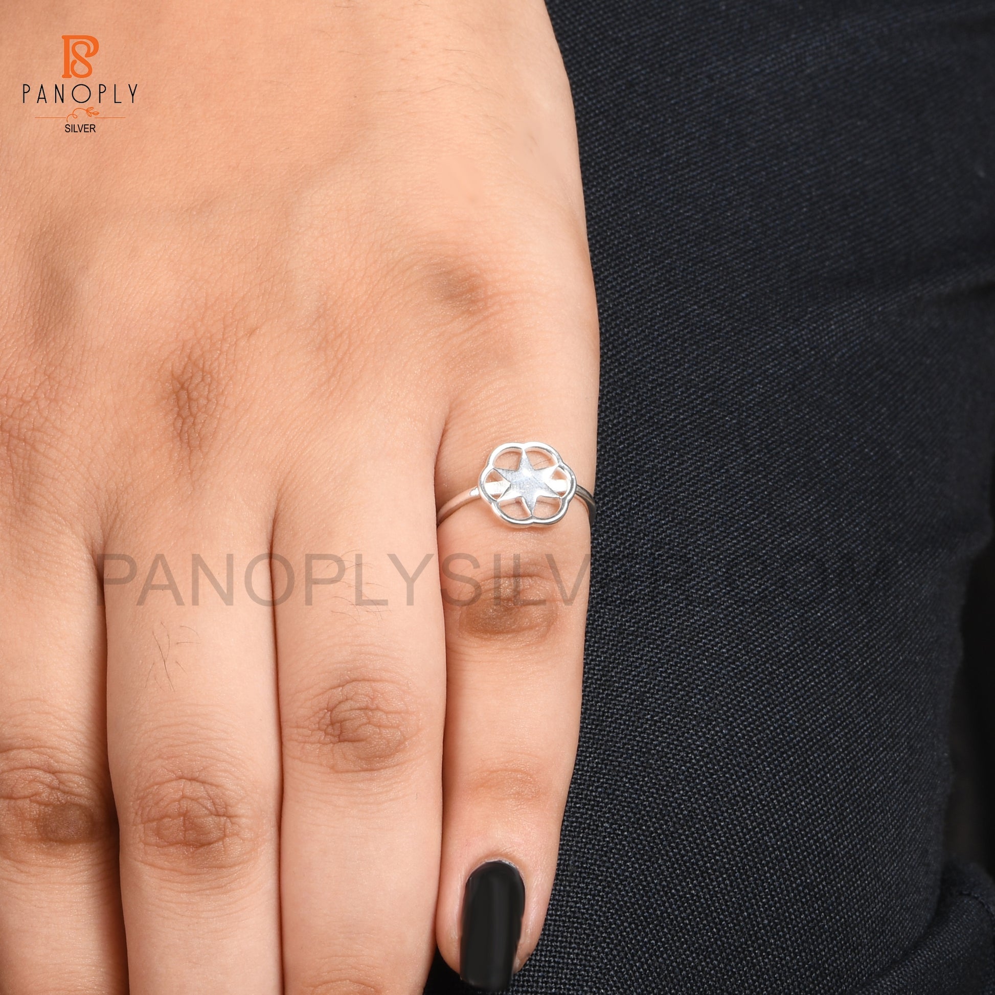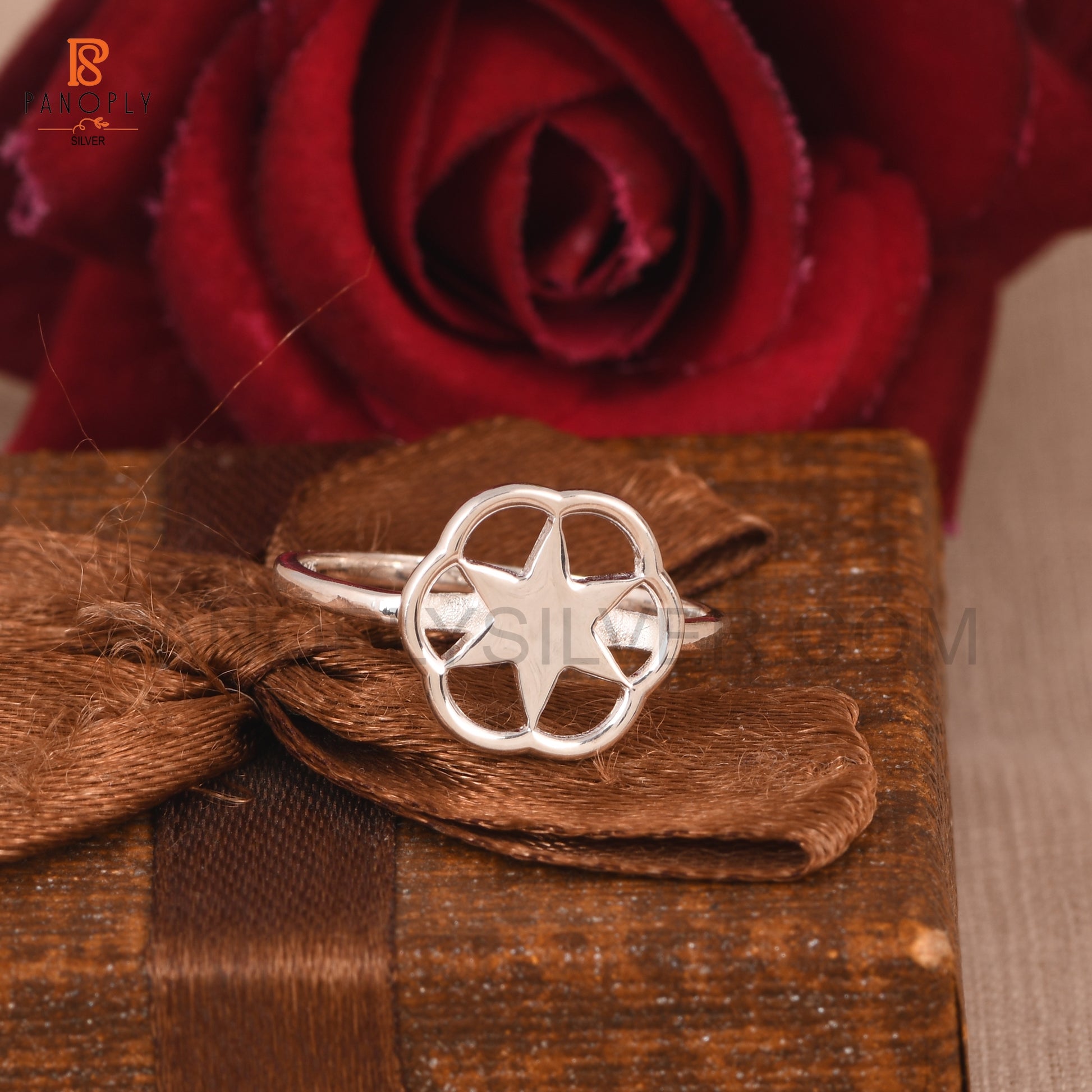 Silver Star Ring with Flower Design, Dainty Statement Ring